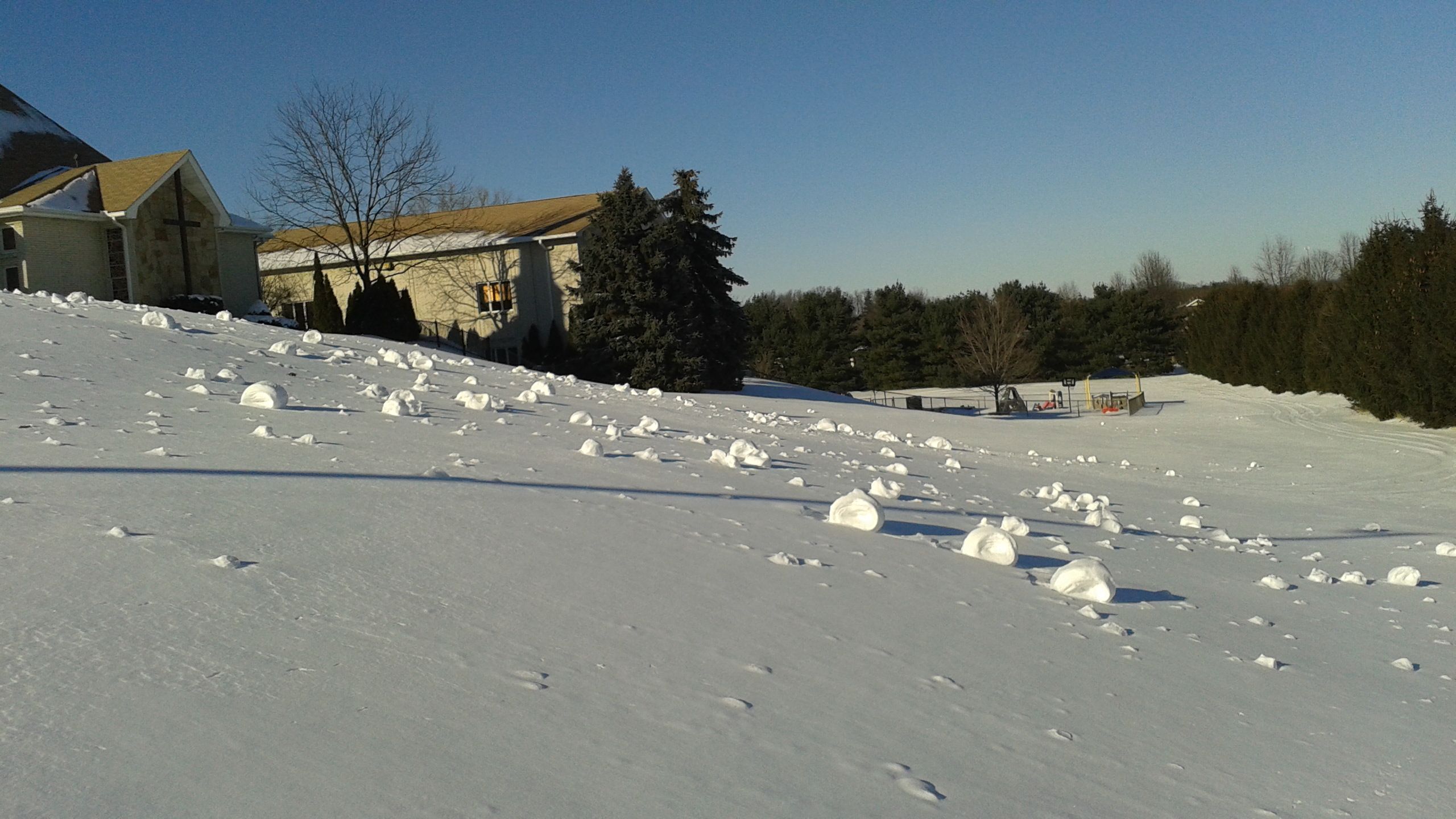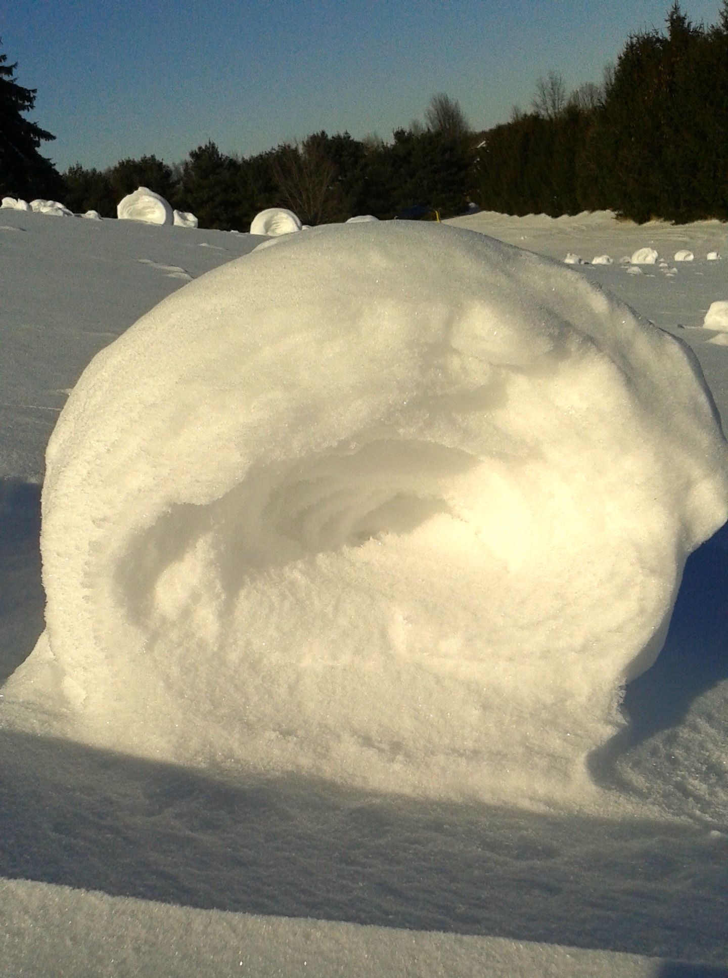 These oddly shaped snowballs occur naturally when the conditions are just right. There has to be a layer of ice with a layer of loose, wet snow on top that is near the melting point. Finally the wind has to be strong enough to move the rollers but not enough to damage them.