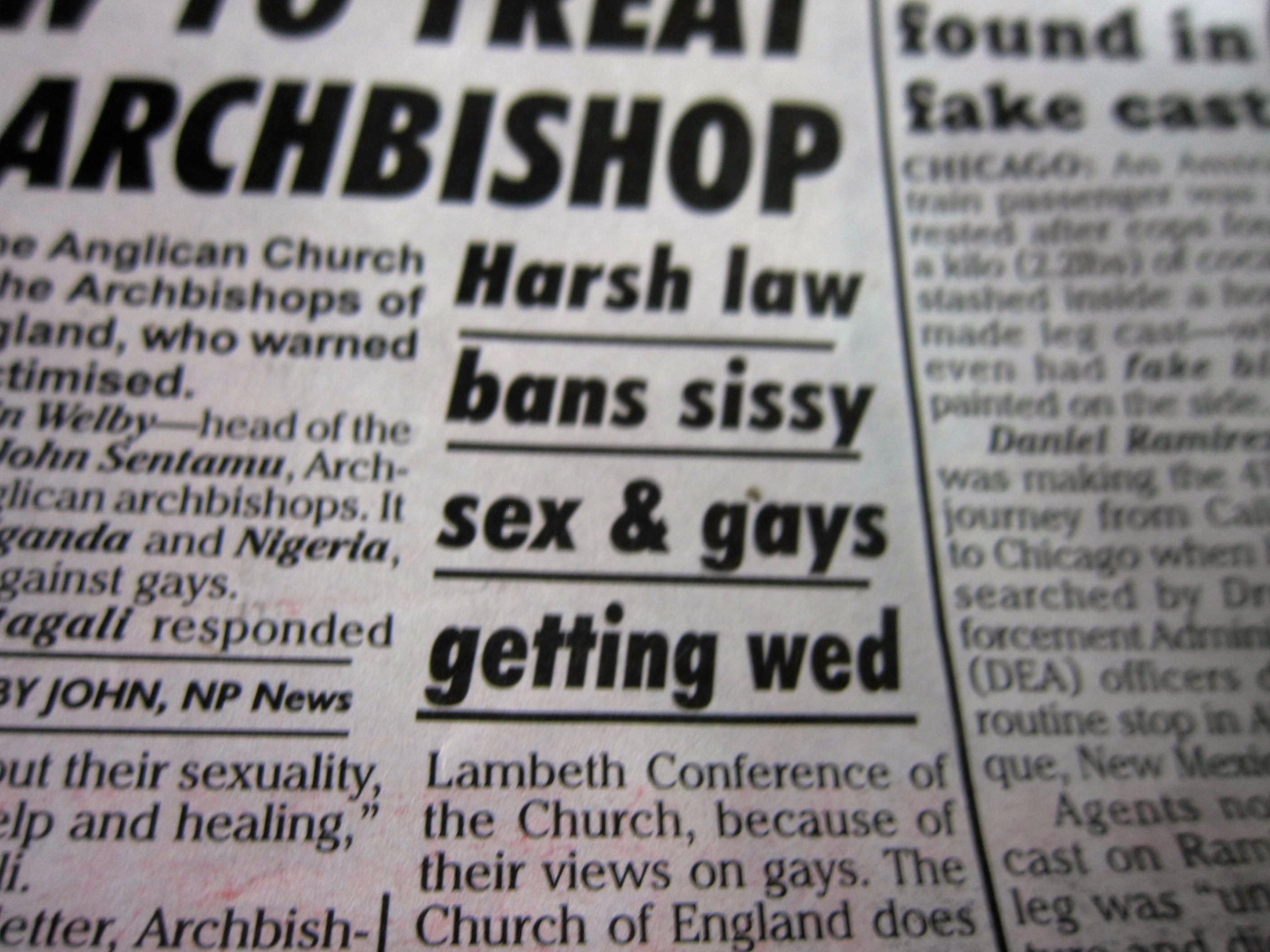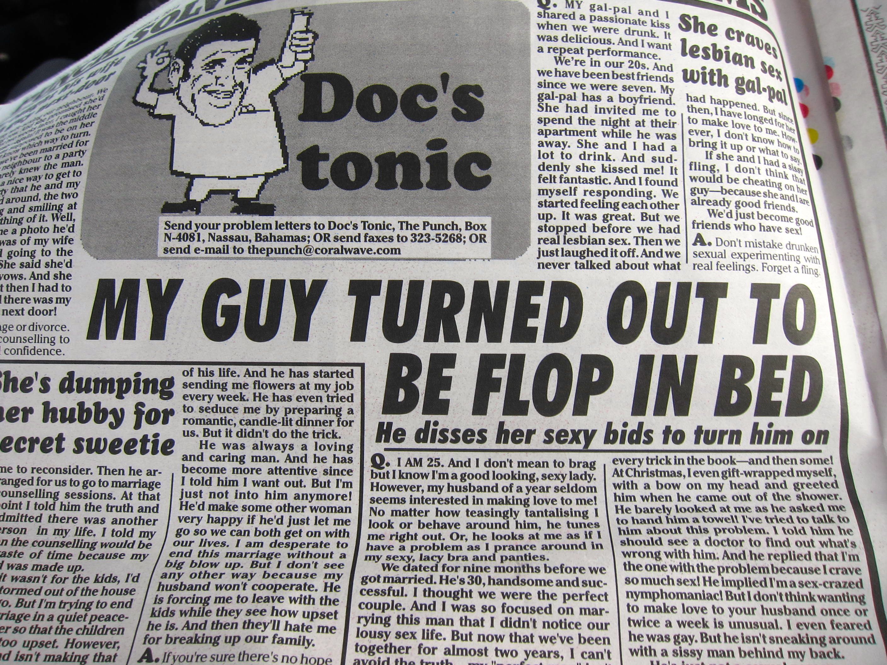 Earlier that day I took a cab into town, which is a decent ride away from the shipyard. The cab driver was very intent on telling us everything he knew about the Bahamas, all the while driving slower and slower as he got more interested in what he was telling us and less and less interested in the road. He gave me a local newspaper that has some of the strangest headlines I’ve ever seen.