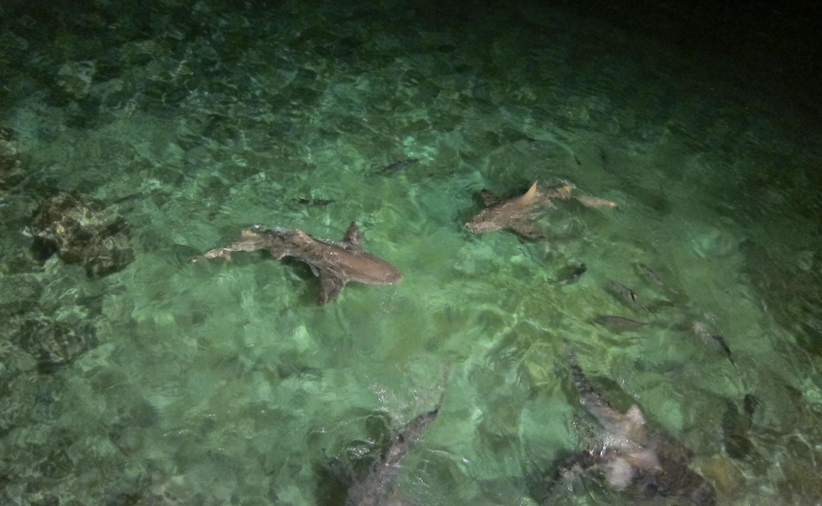 I think they are some kind of reef sharks. A few of them were quite large, though I doubt they are very ferocious, as they seem to know when to get a free meal at feeding time!