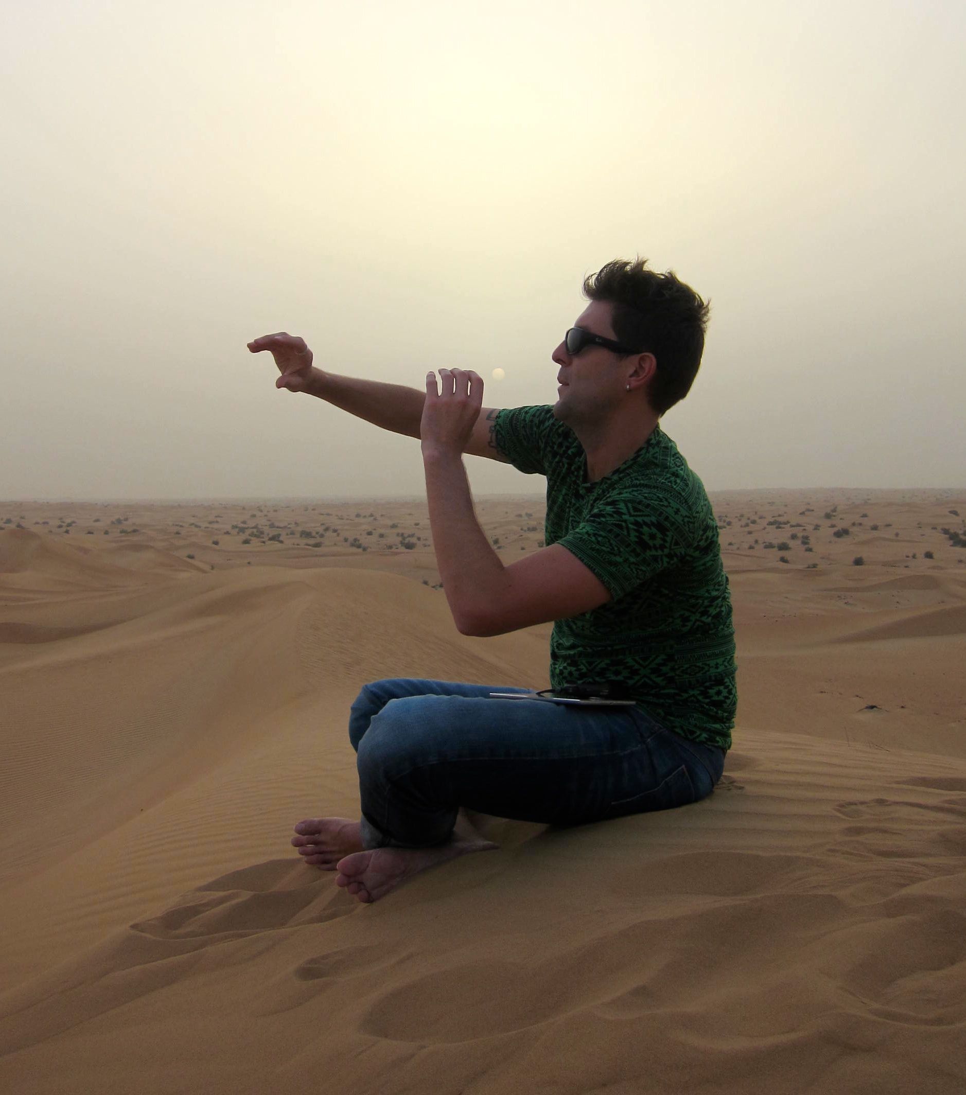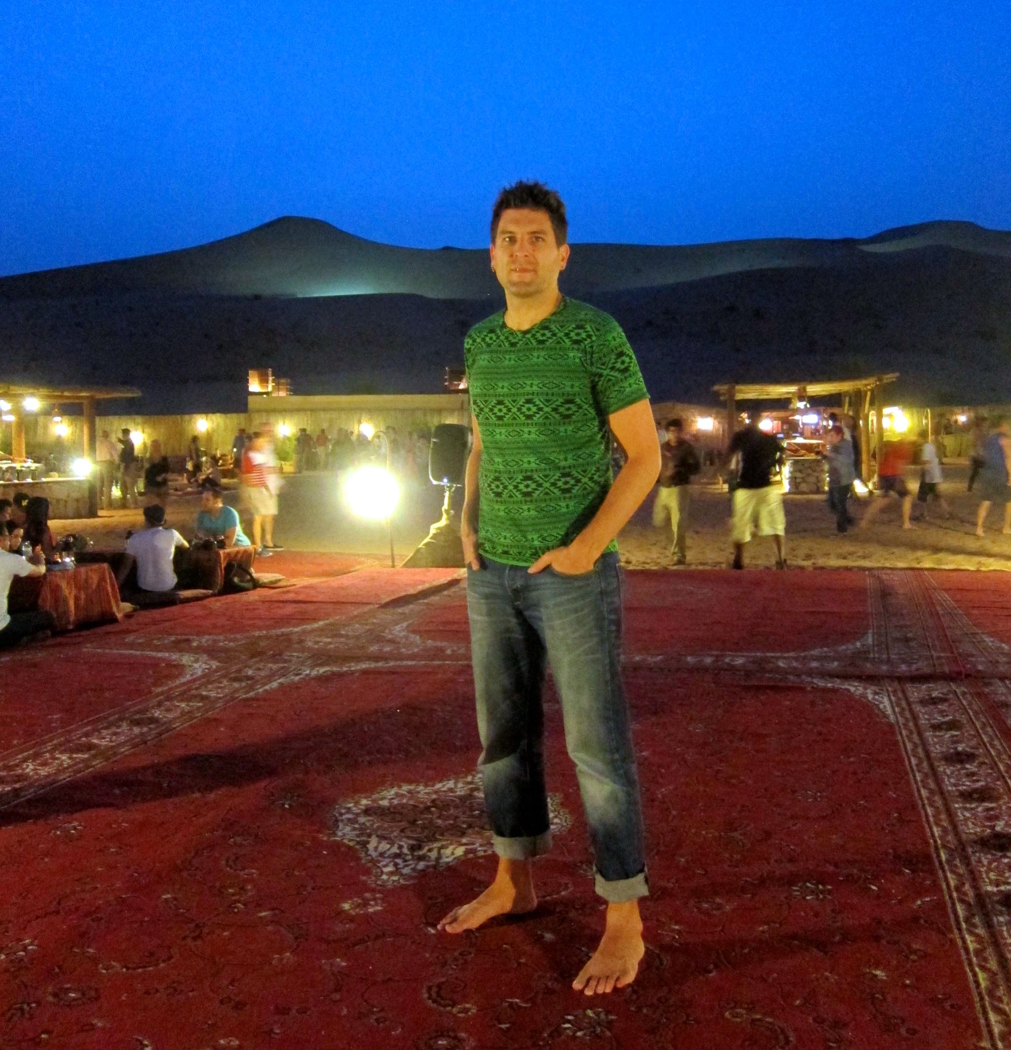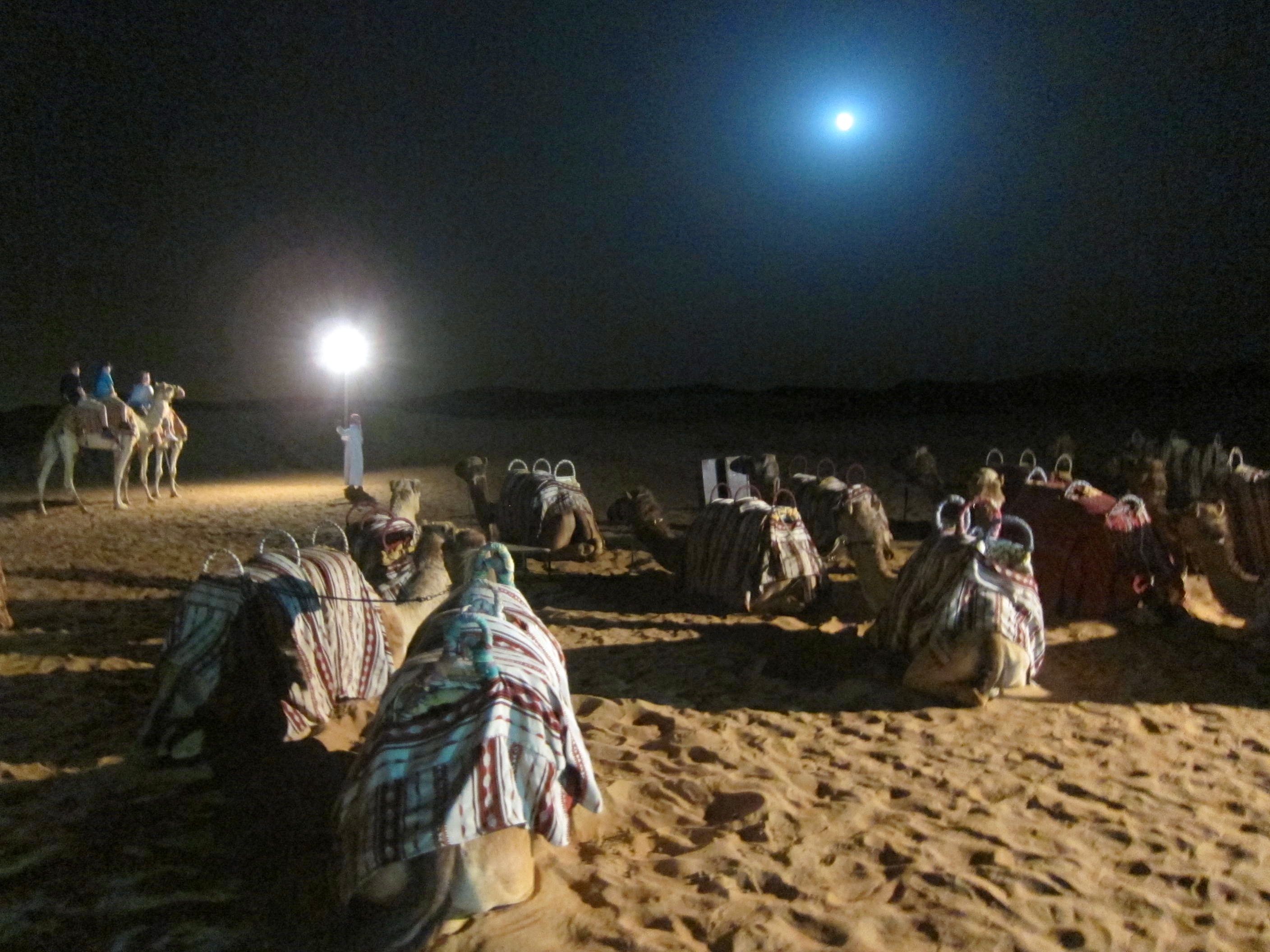 The sun set and it became clear that they had put lights behind the massive sand dune adjacent to the camp. This created a glowing effect that made for a striking background. An announcement was made that they were beginning to serve the first course. We wandered around barefoot in the sand to sample falafel, a variety of flatbreads with different condiments, and other fried things. There were big selections of humus, tabouleh, olives, and breads. Curried vegetables and grilled meats were served for the mains. In between courses we shuffled around to henna tattoo artists and smoke shisha while sitting in big circles on more low cushions.