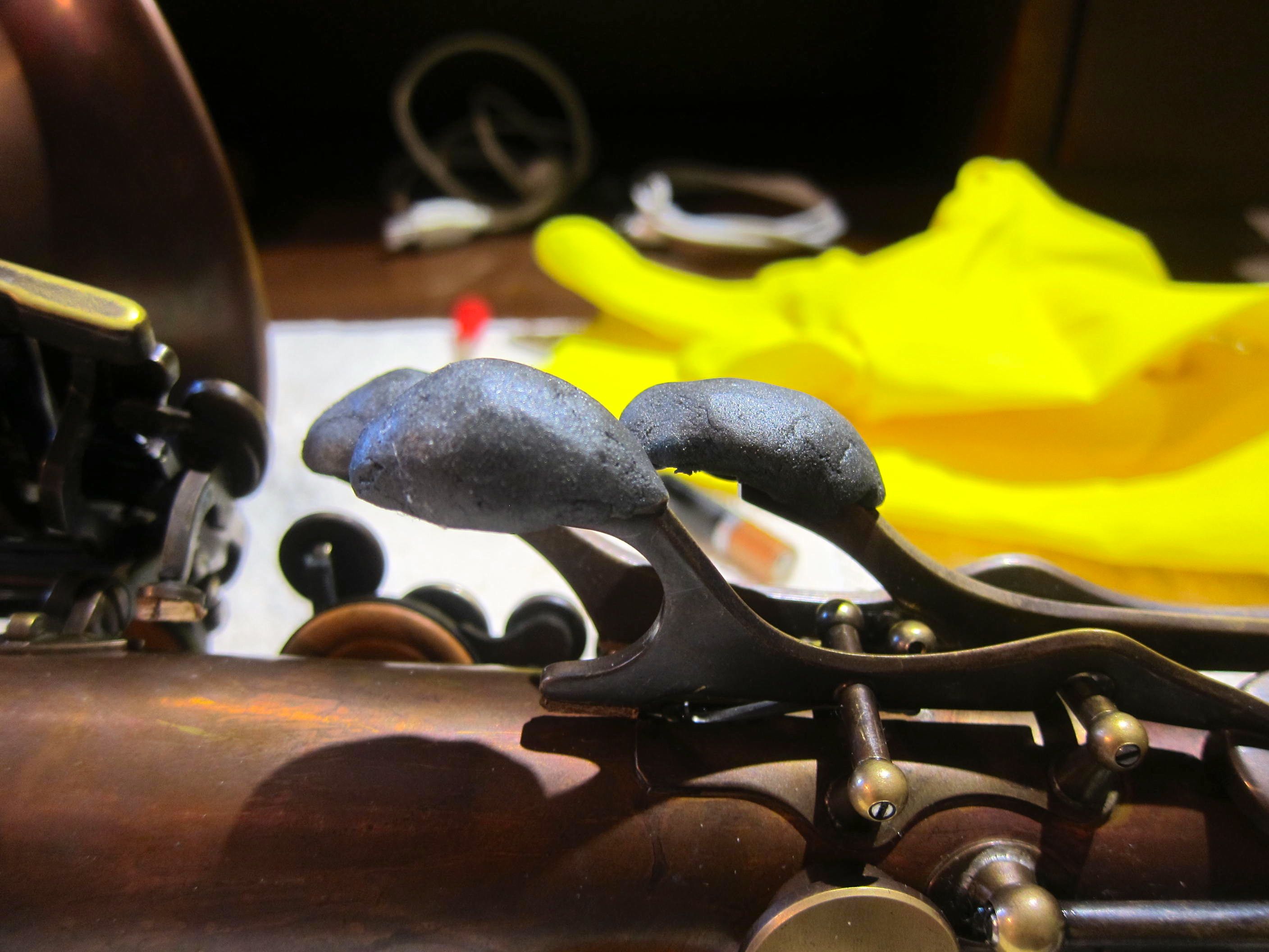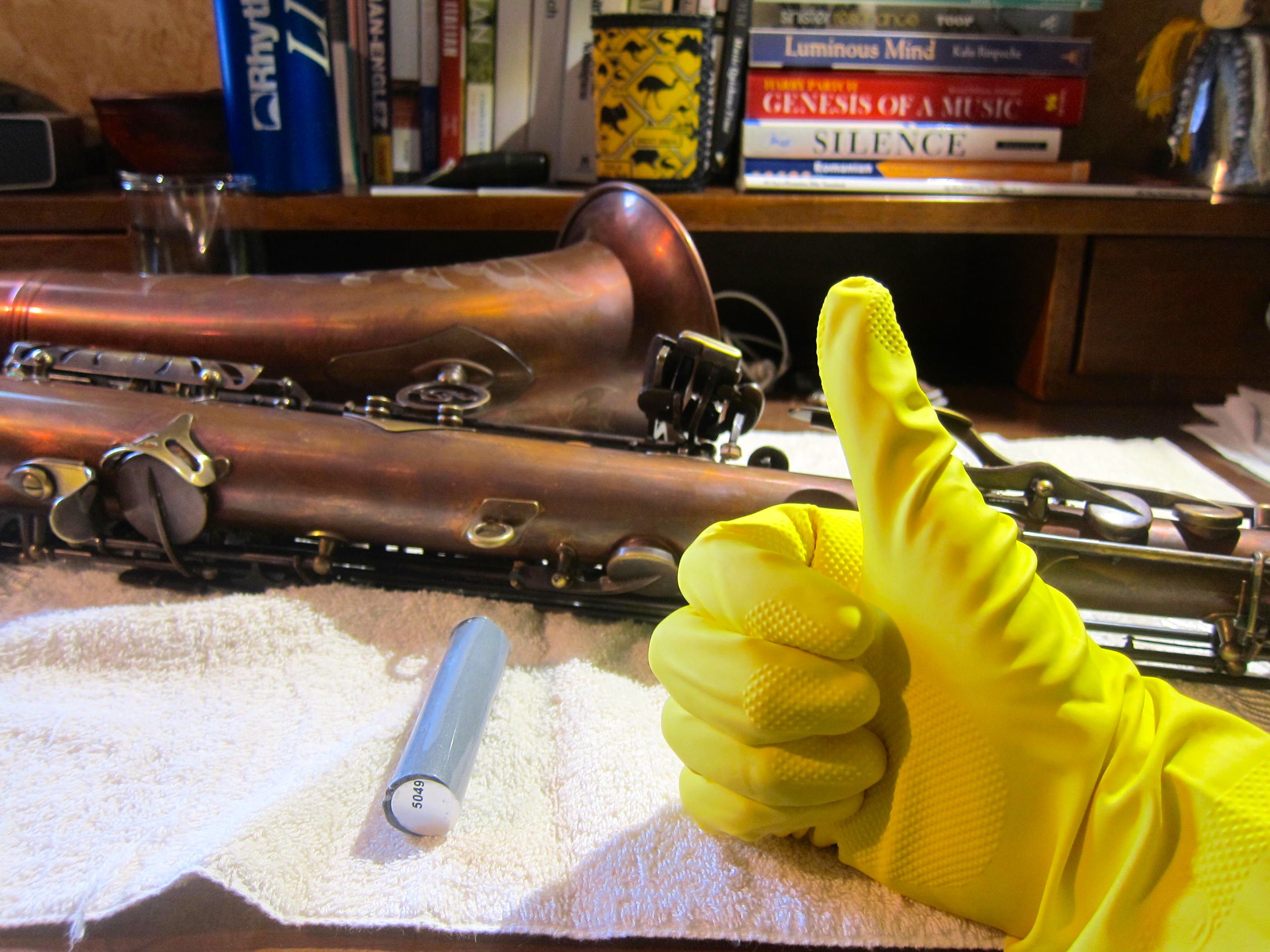 Step 2. Prepare you’re instrument/workspace. This stuff sets pretty quickly so you’ll need to make a workspace that is clear of obstructions. Lay the horn down with the palm keys up. I like to leave the keys on while doing this so that I can see how they will fit into the palm of my had when I’m holding the horn. You’ll need to make sure that the palm keys are clean, otherwise they might not bond with the epoxy.