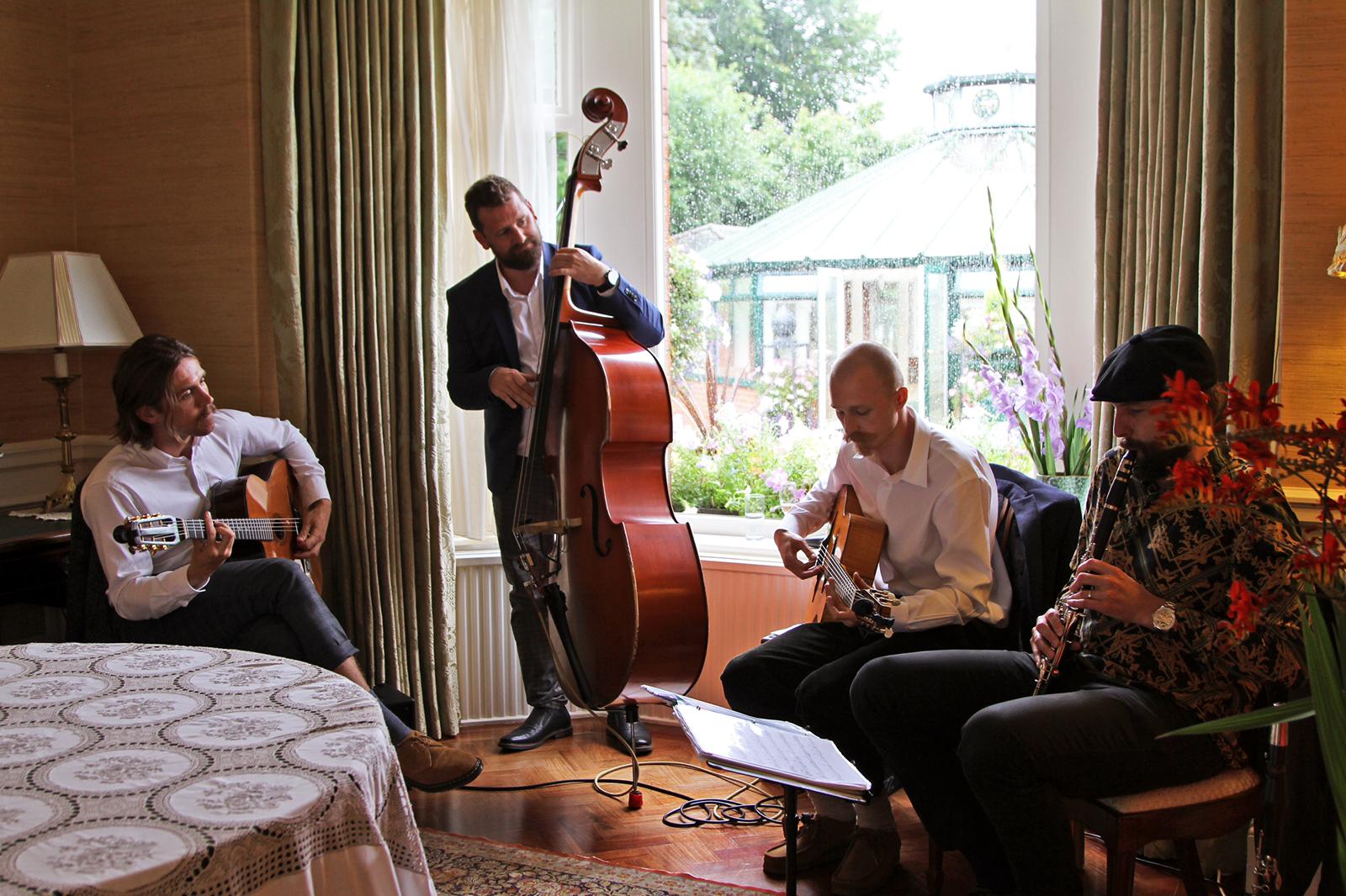 I’m playing Gypsy jazz with a new six-piece band here in Manchester though often we play as smaller configurations for private events. Over the weekend we had a little quartet gig for a private function in a some pretty swanky digs out in Radcliff.